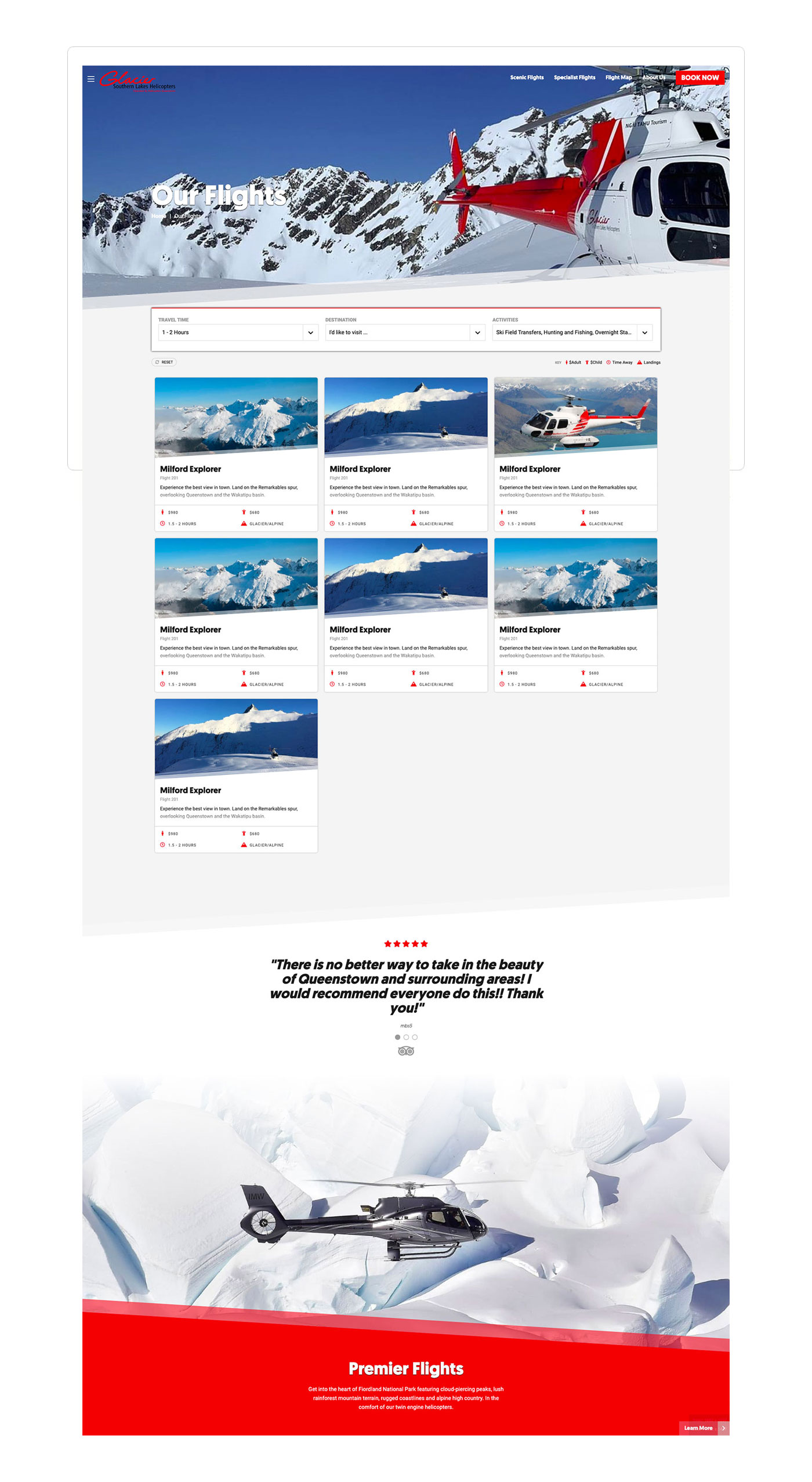 The design was focused on provided multiple gateways to navigate the vast range of flights available. Initially via a mega-menu which organised the flights based around regions/areas and included a fly-out section to browse all flights in each section. The user would also have the option to use a filtering page, where they could view flights based around travel time, destination, and activities available.